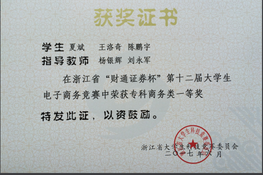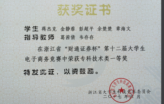 浙江省大学生电子商务竞赛是由浙江省教育厅主办的 A 类学科竞赛,自 2006 年起,每年的竞赛为前六届全国大学生电子商务“创新、创意及创业”挑战赛选送了大量优秀的作品。该竞赛提高了学生在电子商务方面理论与实践相结合的能力,培养和树立了大学生的创新意识,丰富和活跃了校园文化氛围,培养出了一大批具有创新、创业能力的优秀学生,为社会发展输送了大量电子商务方面的优秀人才。