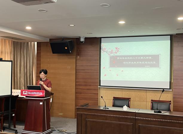 徐盈群重点围绕党的二十大报告、《关于推动现代职业教育高质量发展的意见》中关于职业教育的重要论述关于推进现代职业教育体系建设改革的重大举措如何结合学校实际,推动职业教育高质量发展的思考与体会等三个方面进行了授课。她强调,党的二十大报告首次将教育强国、科技强国和人才强国结合起来合并阐述,明确要求一体化推进教育,说明了教育支撑、输送人才的重要意义。她指出,健全终身职业技能培训制度,加快建设包括大国工匠和高技能人才在内的国家战略人才力量建设全民终身学习的学习型社会、学习型大国这一系列政策导向都对职业教育提供了更明确的发展方向。