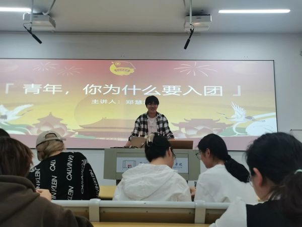 此节课郑慧波同学讲授的内容为“青年,你为什么要入团”。郑慧波同学在课上播放了《光荣啊,中国共青团》的歌曲。在该歌曲中,一声声嘹亮,铿锵有力的歌声激发了每个人的爱国热情,激励了一代又一代的青年。同时,也展示了当时的人民互帮互助的精神和昂扬的斗志。