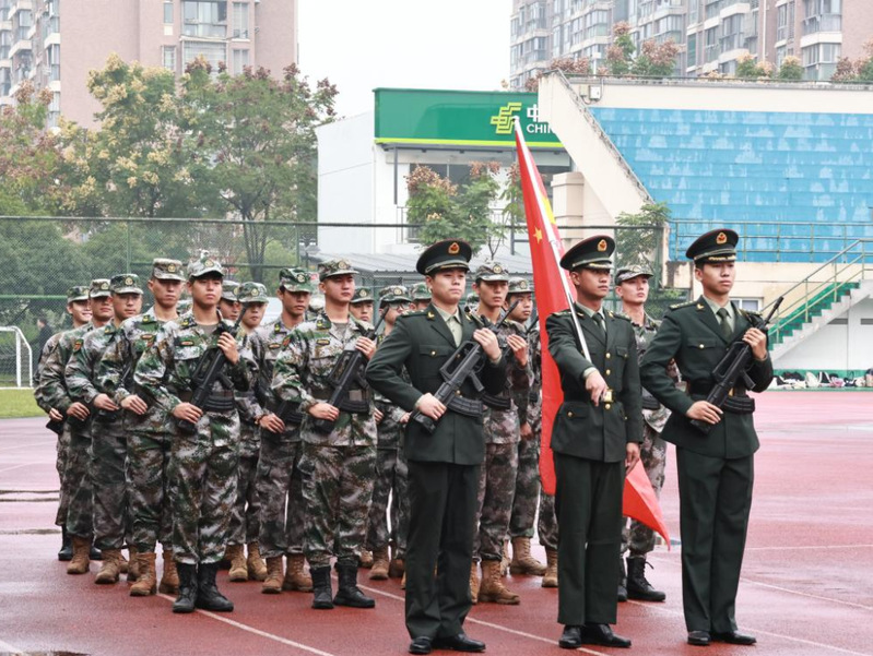 秋风作序,晨光熹微。在主持人宣布活动正式开始后,口令作响,笔挺齐整的国旗护卫队伍迈着有力的步伐向国旗行进,走至国旗台前的干练转向坚定划出信仰的棱角。当《义勇军进行曲》响彻操场,五星红旗冉冉升向天际,学员们的注目肃穆而庄敬。