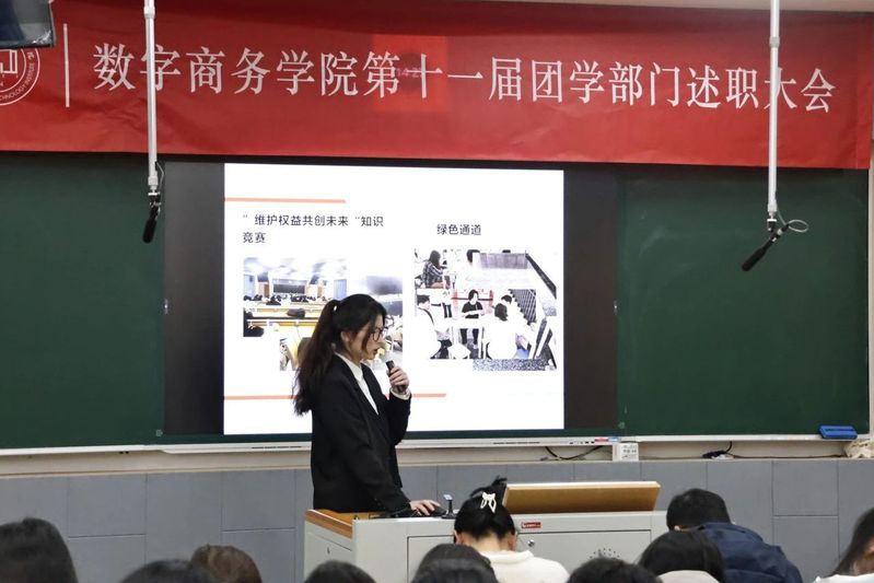 大会第三项议程,团总支各部门按照团总支办公室、组织部、青年志愿者协会、第二课堂鉴定中心、青年志愿者协会、科创部、宣传部、实践部的顺序依次进行本届述职汇报。各部门主要围绕本学期的工作特色与成效,查找问题不足,明确改进方向,总结了在思想引领、服务同学、促进校园文化建设等方面取得的积极成效。