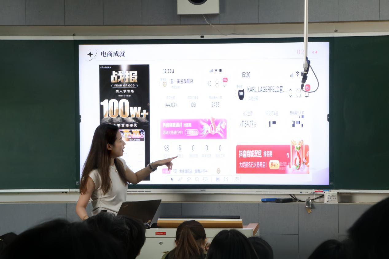 活动伊始,亮剑运营经理吴家怡以“电商人的自我修炼”为切入点,向学生介绍了个人职业历程。从2019年起步,凭借1万粉丝就能实现单场带货超10万的佳绩。2020年,她转战上海虎巴科技,单月微信端销售额突破500万。随后在抖音赛道,她参与打造“岳家军”“一折姐”等达人号,单月单场GMV破百万,还成功运营多个抖音、天猫女装店铺账号,实现销量飞跃,双十一助马天奴女装登顶天猫带货榜。自2020年末至今,在宁波亮剑互娱影视文化有限公司担任运营经理,助力“hotwind热风”“不莱枚箱包”等账号从0到1崛起,热风单场销售额达百万,不莱枚0粉开播十天单场突破31万。其丰富的履历与真诚的分享迅速拉近了与学生的距离。